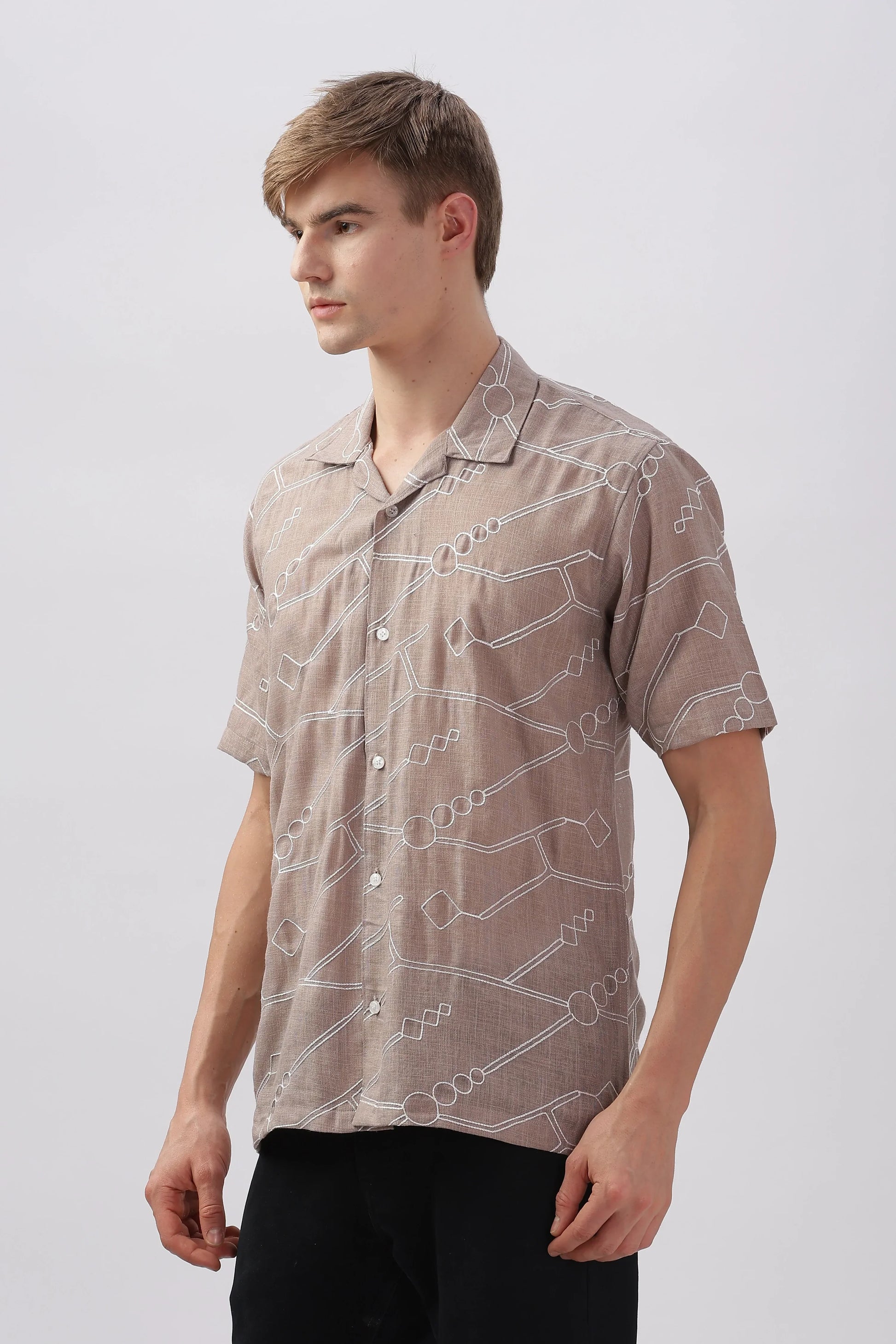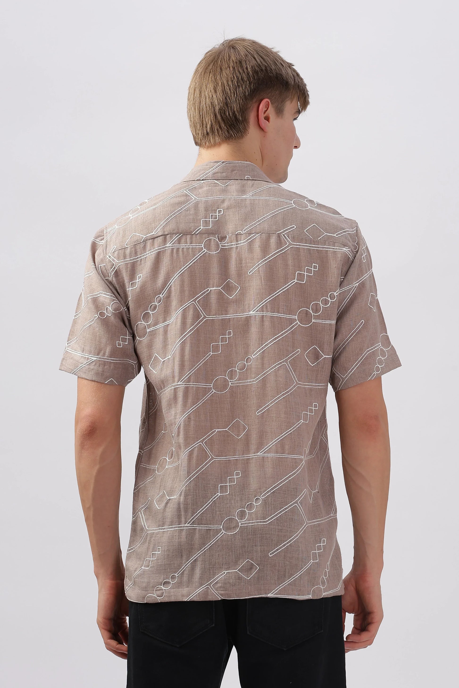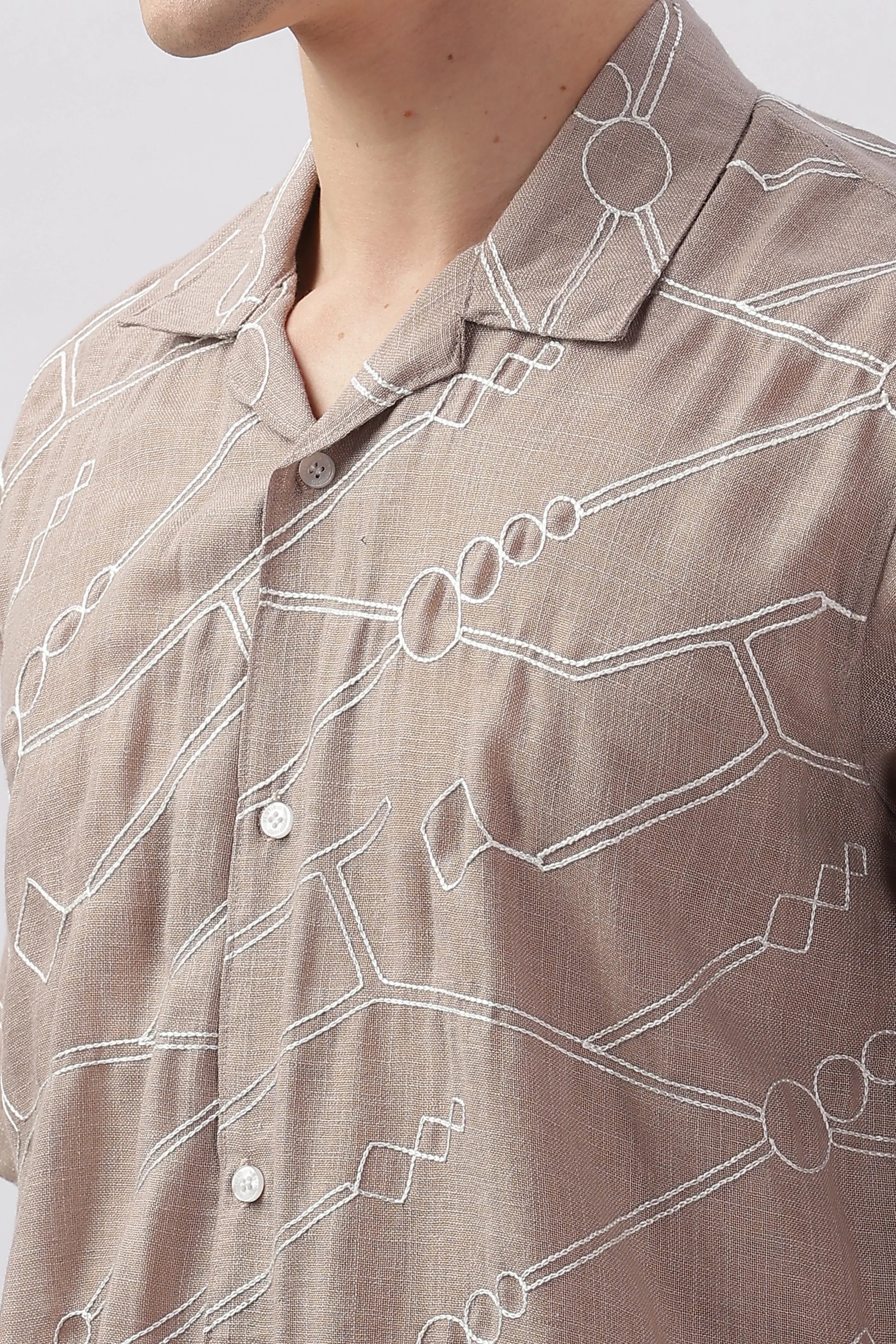 Light brown abstract linen embroidered half sleeve shirt